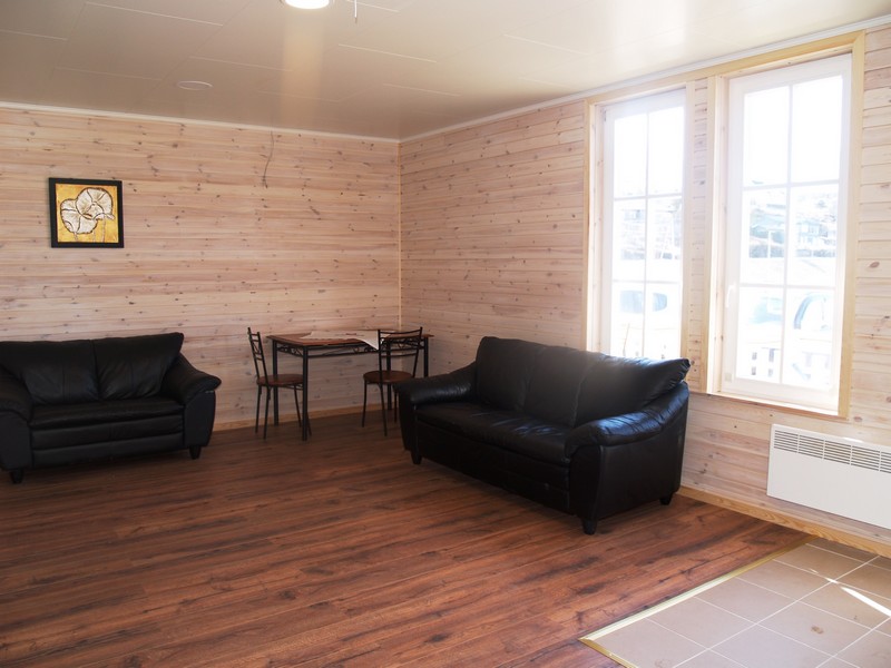Terrasse. Wohnzimmer mit Fjordblick, ausgestattet mit zwei Sofas bzw. einem Ecksofa, E-Heizung, TV und Essecke. Küche ausgestattet mit 4-Platten Herd, Dunstabzug, Geschirrspüler, Kühl-Gefrierkombi, Kaffeemaschine, Toaster, Wasserkocher. Ein Bad mit Dusche und WC. 2 Schlafzimmer mit je 2 Einzelbetten.