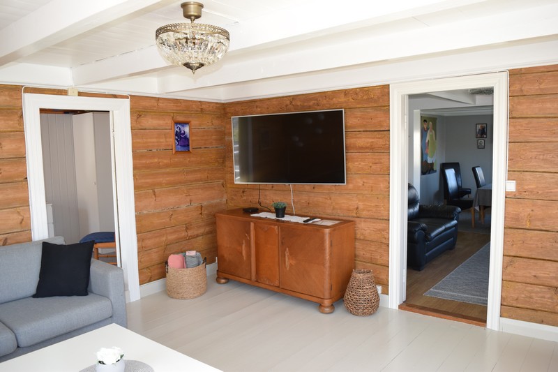 Wohnzimmer mit Fjordblick, Sofa & Sesselecke, E-Heizung, Sat-TV. Essbereich. Küche mit 4-Platten-Herd, Backofen, Kaffeemaschine, Wasserkocher, Kühlschrank, Tiefkühltruhe. Bad mit Dusche, WC, Waschbecken, Waschmaschine, Trockner. 1 Gäste-WC. 1 SZ mit Doppelbett und Einzelbett, 2 SZ mit je 2 Einzelbetten. 200m zum Hafen von Åvik Brygge.