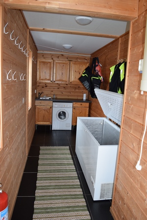 Tiefkühltruhe. Waschmaschine. Bad mit Dusche, WC, Waschbecken.