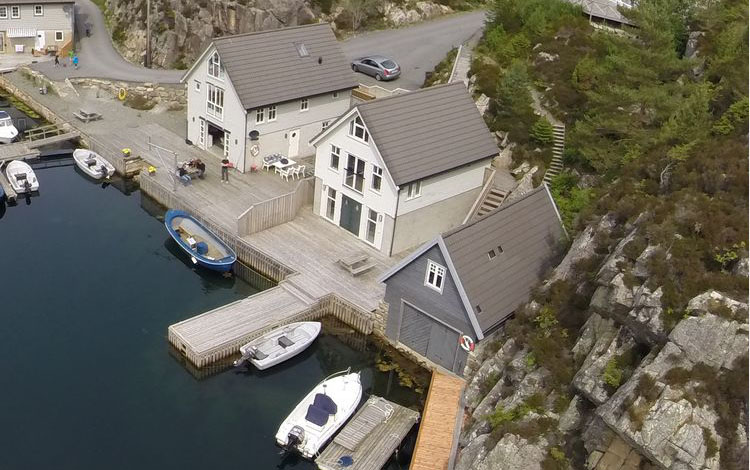 Ein Top-Ferienhaus direkt am Kai mit großer Terrasse und tollem Blick auf die Hausbucht. Die Ausstattung ist einfach klasse und besonders gemütlich. Wohnzimmer mit Couchecke, Terrasse zum Fjord, E-Heizung, SAT-TV, Radio, Essecke. Voll ausgestattete moderne Studioküche mit 4-Platten-Ceranherd, Backofen, Dunstabzug, Spülmaschine, Kaffeemaschine, Kühlschrank, Mikrowelle, Toaster. 2 Badezimmer mit Dusche, WC, Waschbecken. Waschmaschine. 1 Schlafzimmer mit Doppelbett, 1 Schlafzimmer mit breitem Einzelbett, 2 Schlafzimmer im Dachgeschoß davon eins mit Panoramafenster und je 2 Einzelbetten, Im EG großzügiger Aufenthaltsraum mit Zugang zum Kai und eigener kleiner Küche, Tiefkühltruhe und reichlich Abstellmöglichkeiten für das Angelgerät. Filetierplatz mit fließendem Wasser.